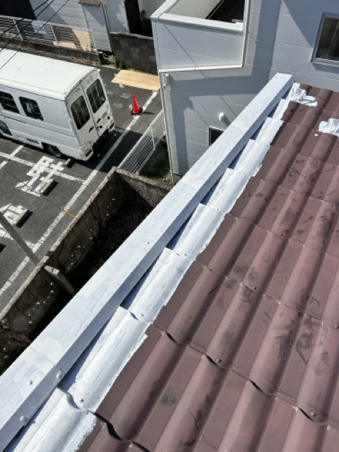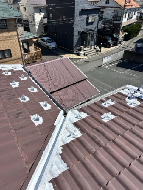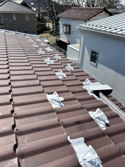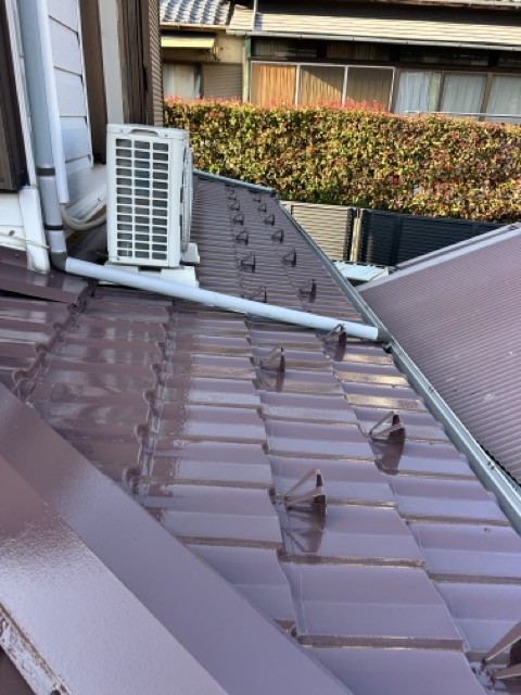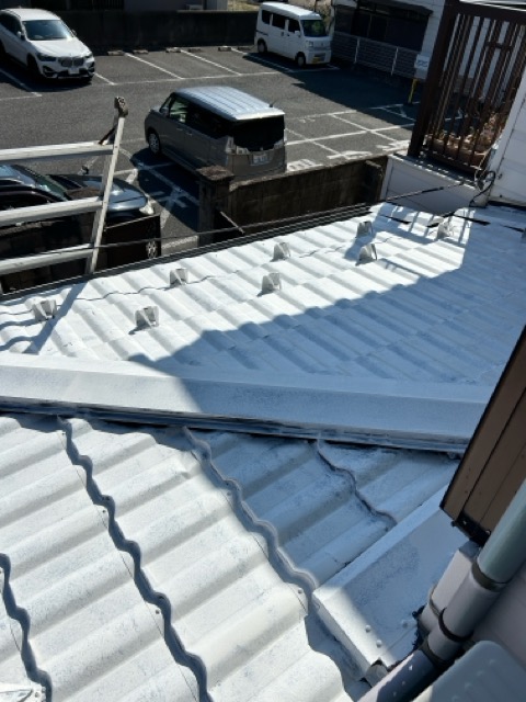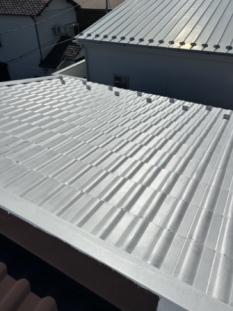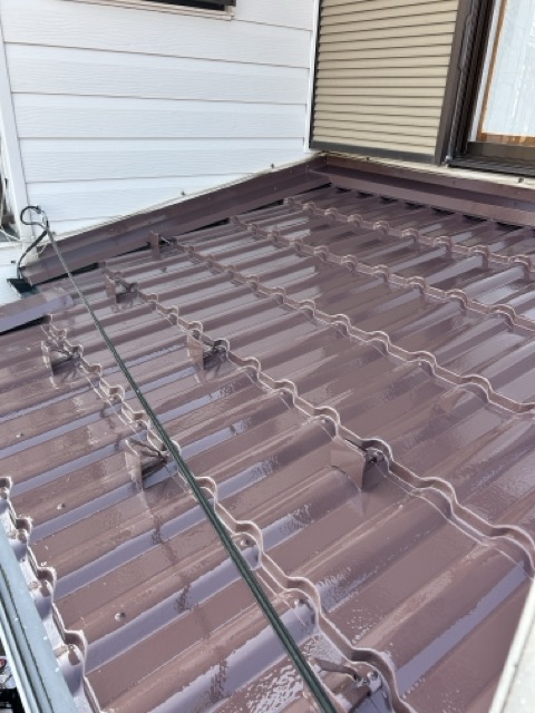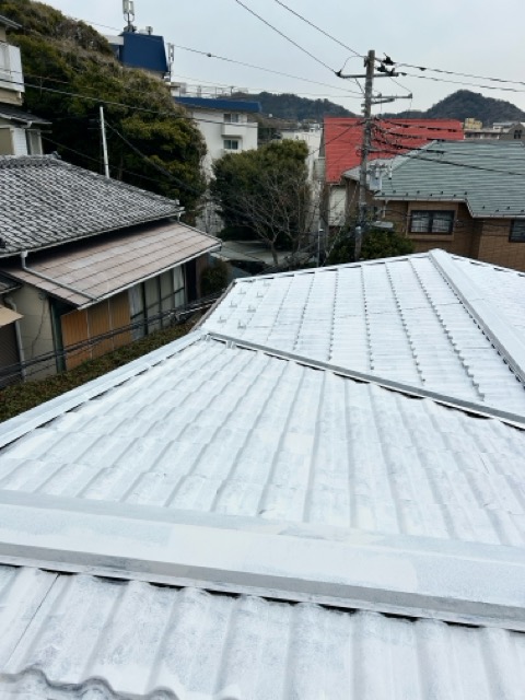 今回は金属屋根の塗装工事を行いました。海が近く塩害によるサビのリスクが高いため、丁寧にサビ止めを施工。その上からSKプレミアムルーフシリコンで仕上げ、美観と耐久性をしっかり向上させました。