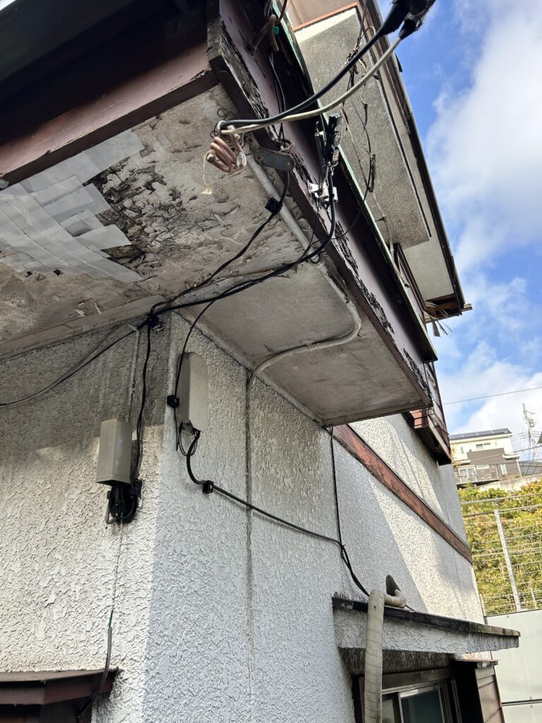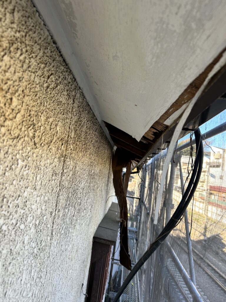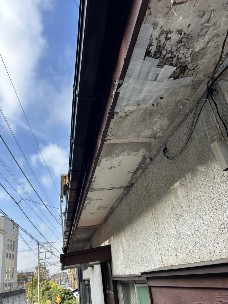 既存の軒天は劣化が進み、破損やめくれがみられる状態でした。