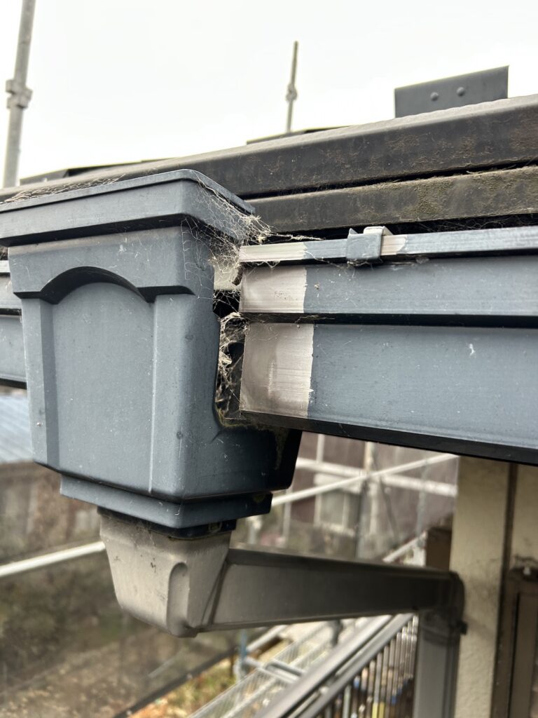 既存の雨樋は変形が見られ、集水マスから軒樋が外れてしまっている状態で、